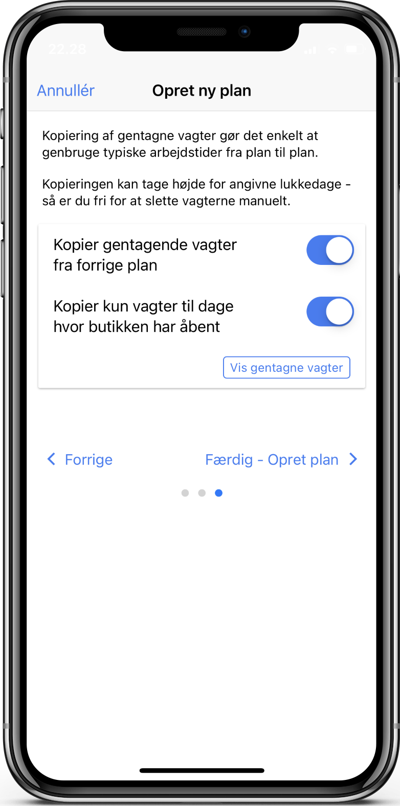 Ved at klikke på OK og vælge næste færdiggøres planen. Du har nu mulighed for at kopiere gentagne vagter fra sidste periode, hvilket dog først er relevant for de næste vagtplaner. Klik derfor på Færdig - Opret Plan og du har nu oprettet din første plan.