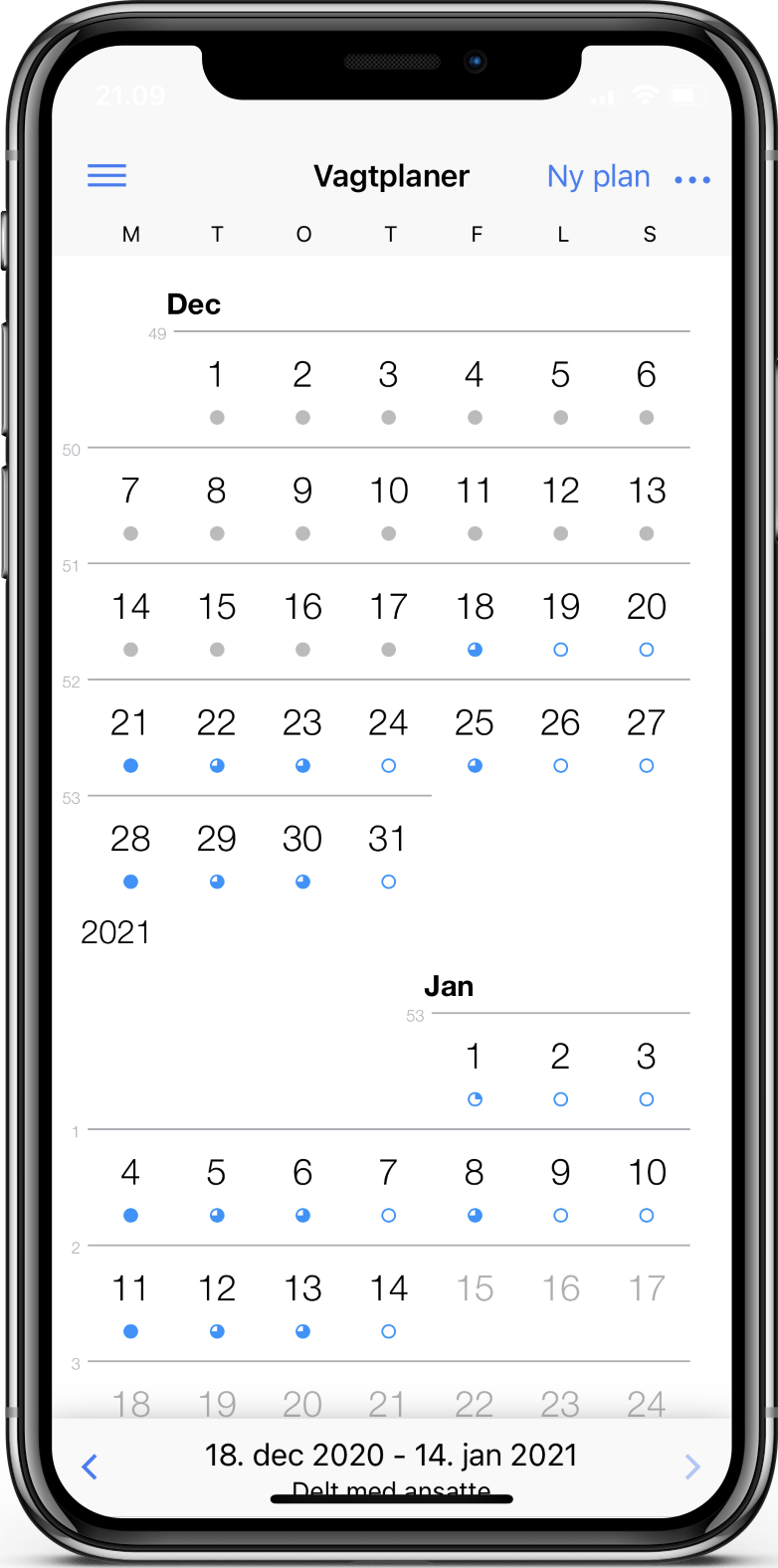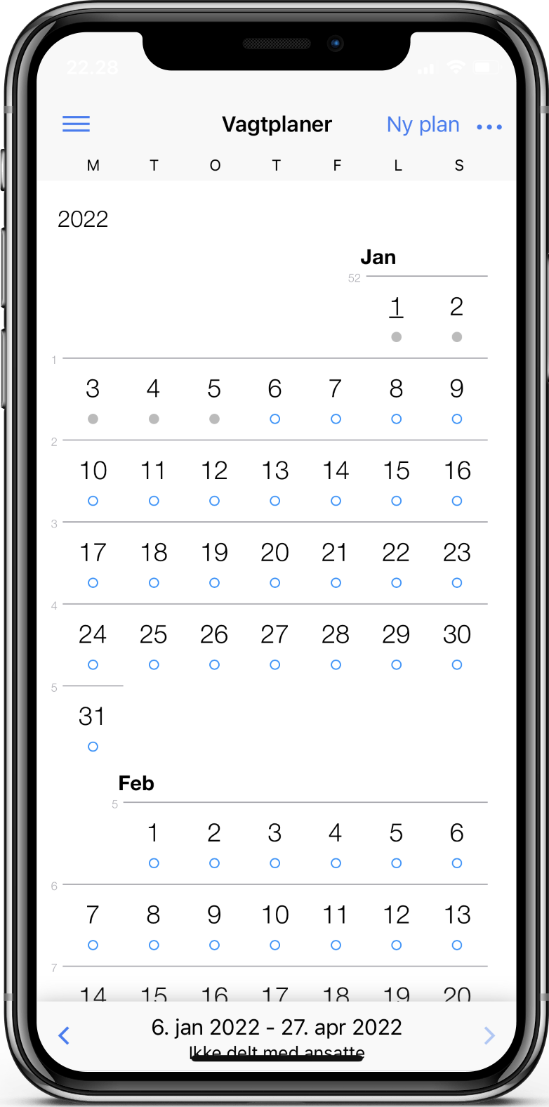 Når du har oprettet din første plan vil den starte med at være tom. Det ses ved, at alle dage i planen har en tom cirkel. Næste skridt er derfor at tilføje vagter til planen.