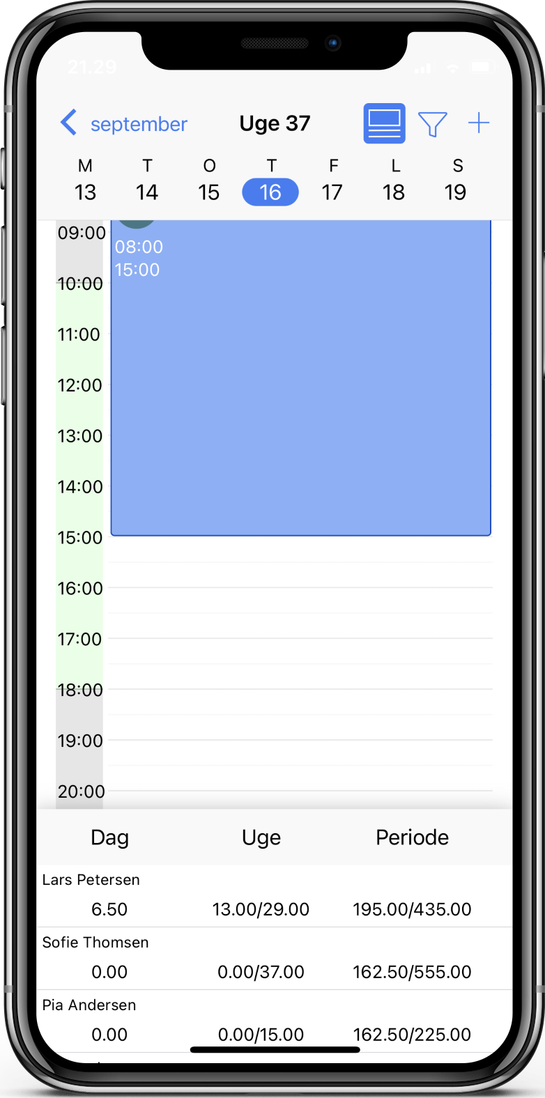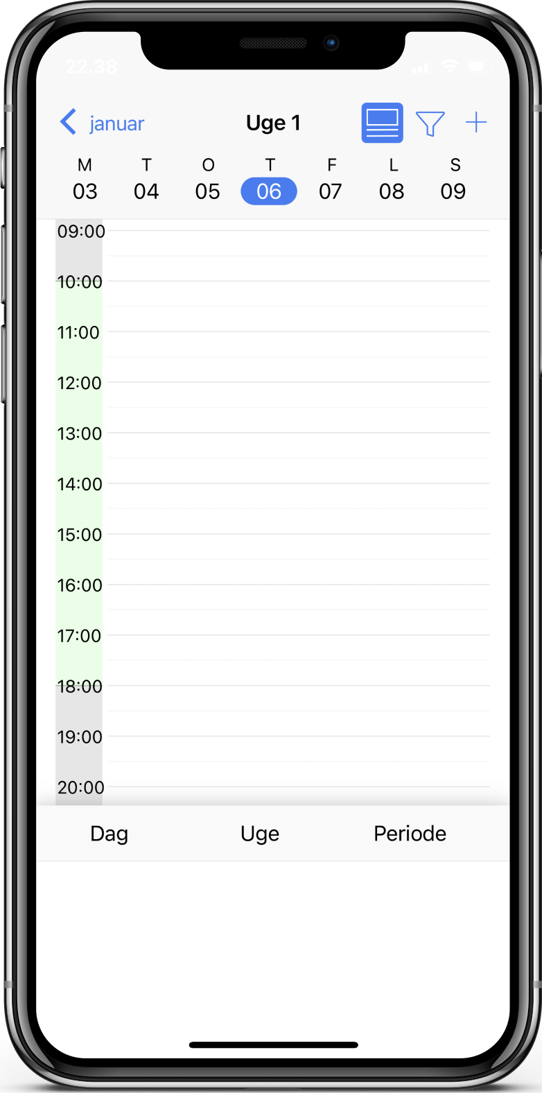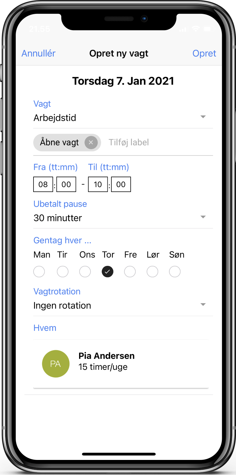 Det grønne område på dagen viser butikkens åbningstid. For at tilføje en vagt til dagen klikker du på plusset i højre hjørne. Du kan nu udfylde informationer for vagten.