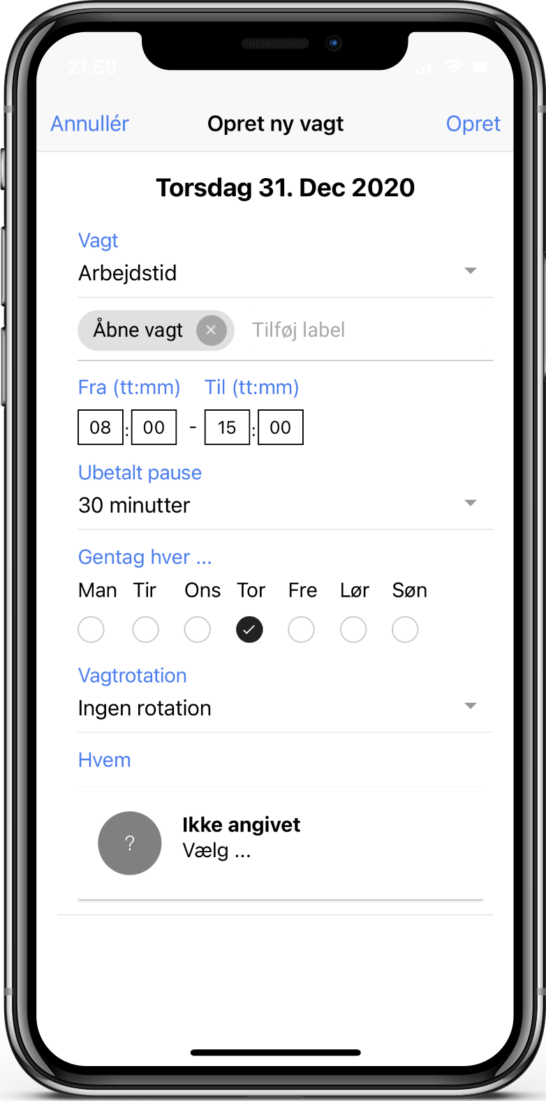 Øverst kan du tilføje et label til vagten. Labels vises som information på medarbejderens personlige vagtplan, men kan også benyttes til at kategorisere arbejdstiden med henblik på eksport til lønberegning. Du angiver herefter start og sluttidspunkt for vagten og om der indgår pause.