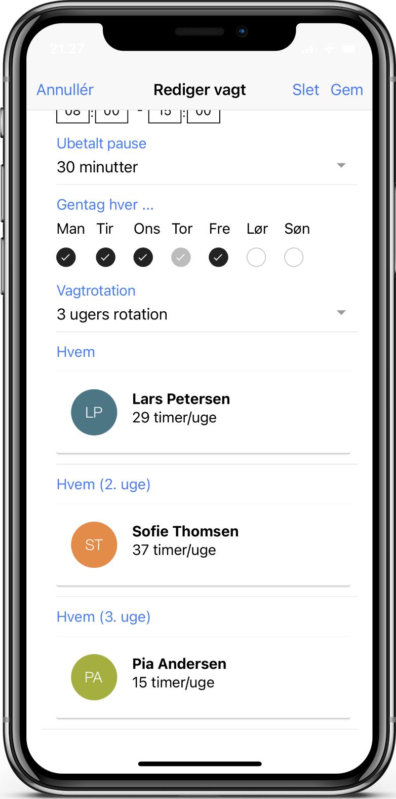 Hvis vagten er sat til at blive gentaget i andre uger, kan du lave en rotation, så forskellige medarbejdere får tildelt vagten i forskellige uger. Først vælges antal ugers rotation og herefter de medarbejdere der indgår i rotationen. Hvis du fx har valgt 3 ugers rotation, kan du derfor vælge 3 medarbejdere i rotationen.