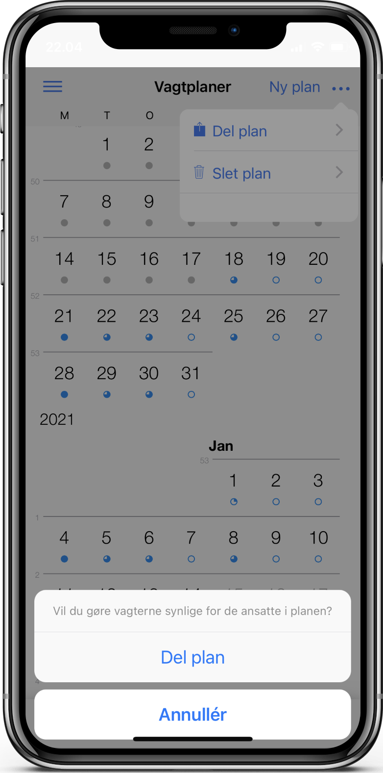 Ved klik på en dag i kalenderen vises vagtplanen for den valgte dag: