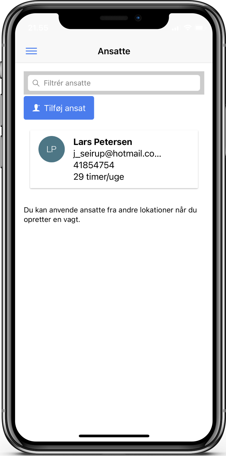 Nu modtager medarbejderen de relevante informationer, så han kan få adgang til sin vagtplan (når den er oprettet).