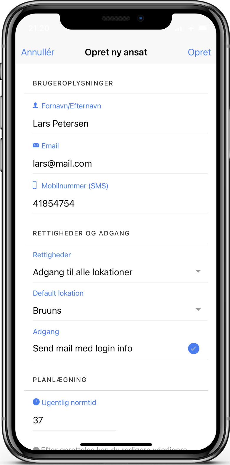 Ved at klikke på Tilføj ansat opretter du din medarbejder. Husk at angive den korrekte ugentlige normtid, da normtiden vil fremgå af oversigter på vagtplanen. Hvis “send mail med login info” er tjekket af fremsendes login og kodeord til medarbejderen umiddelbart efter oprettelse. Du slutter oprettelsen ved at klikke på Opret i øverste højre hjørne.
