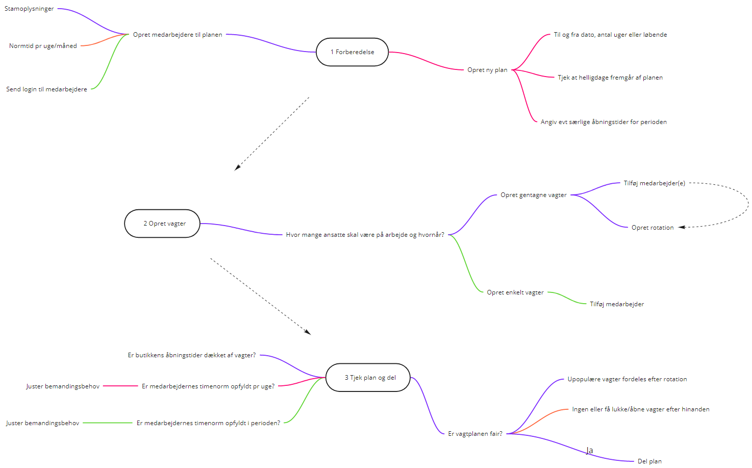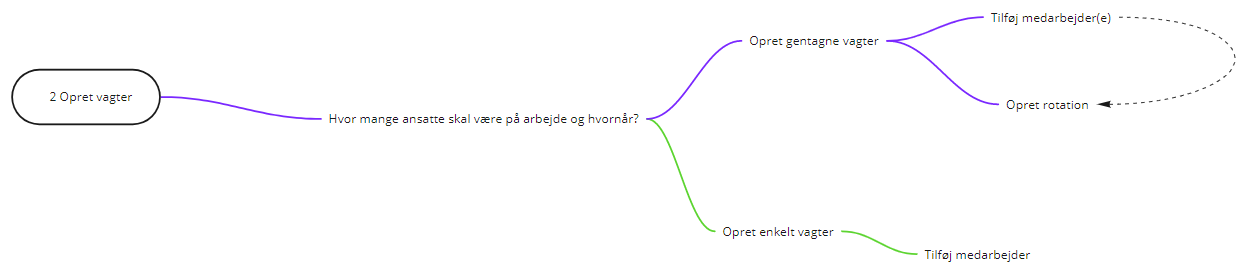 Næste skridt er at tilføje vagter til planen, så hele butikkens åbningstid som minimum er dækket af mindst én vagt. Du skal overveje hvor mange der skal være på arbejde på bestemte tidspunkter i løbet af ugen. Vagter kan oprettes uden medarbejder (som tilføjes senere), og ved at benytte gentagne vagter (med rotation), får du hurtigt din vagtplan fyldt ud. Nedenstående figur viser de trin du skal igennem.