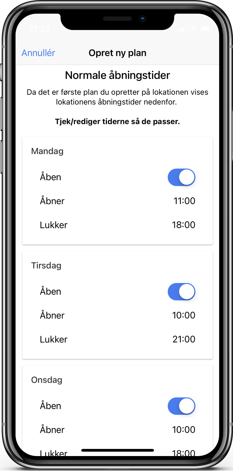 Inden du opretter din første vagtplan skal du angive butikkens normale åbningstider. De normale åbningstider bliver brugt som udgangspunkt ved hver ny vagtplan, men du kan nemt ændre åbningstider på bestemte dage i hver vagtplan (fx ved ‘Open By Night’).