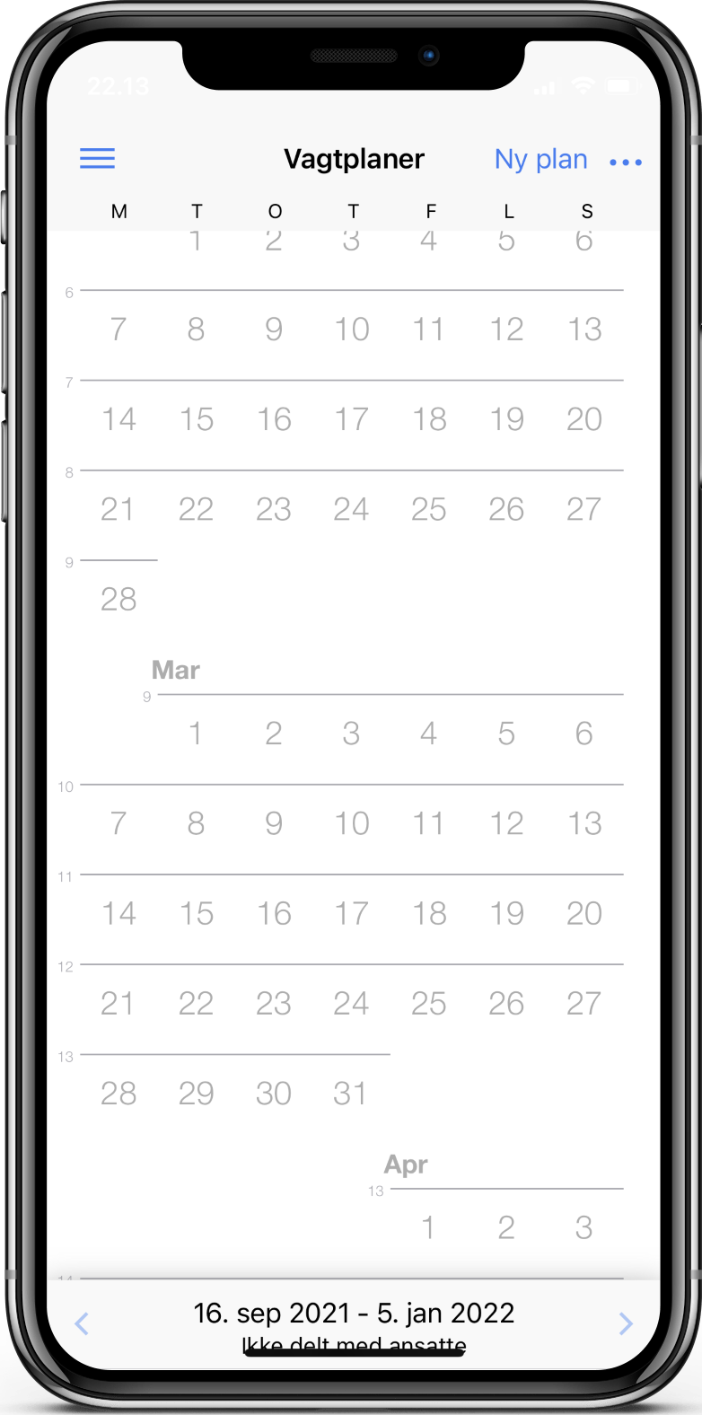 Du ser nu en tom kalender og klikker på Ny plan