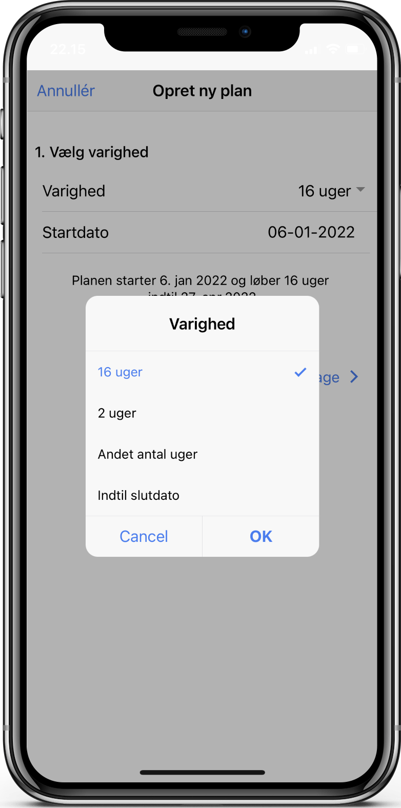 Du starter med at angive varigheden for vagtplanen, der kan angives som antal uger eller en bestemt slutdato.