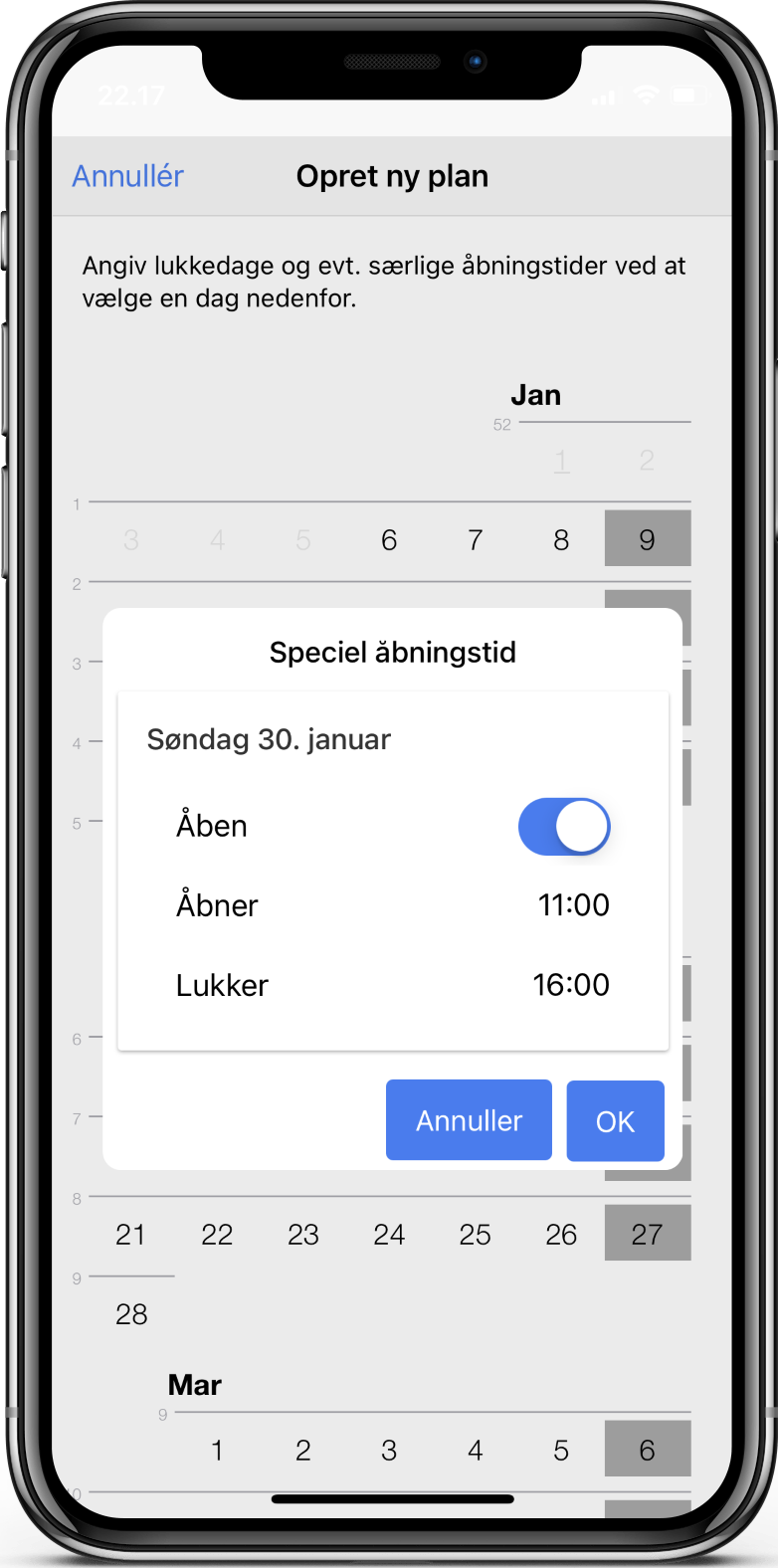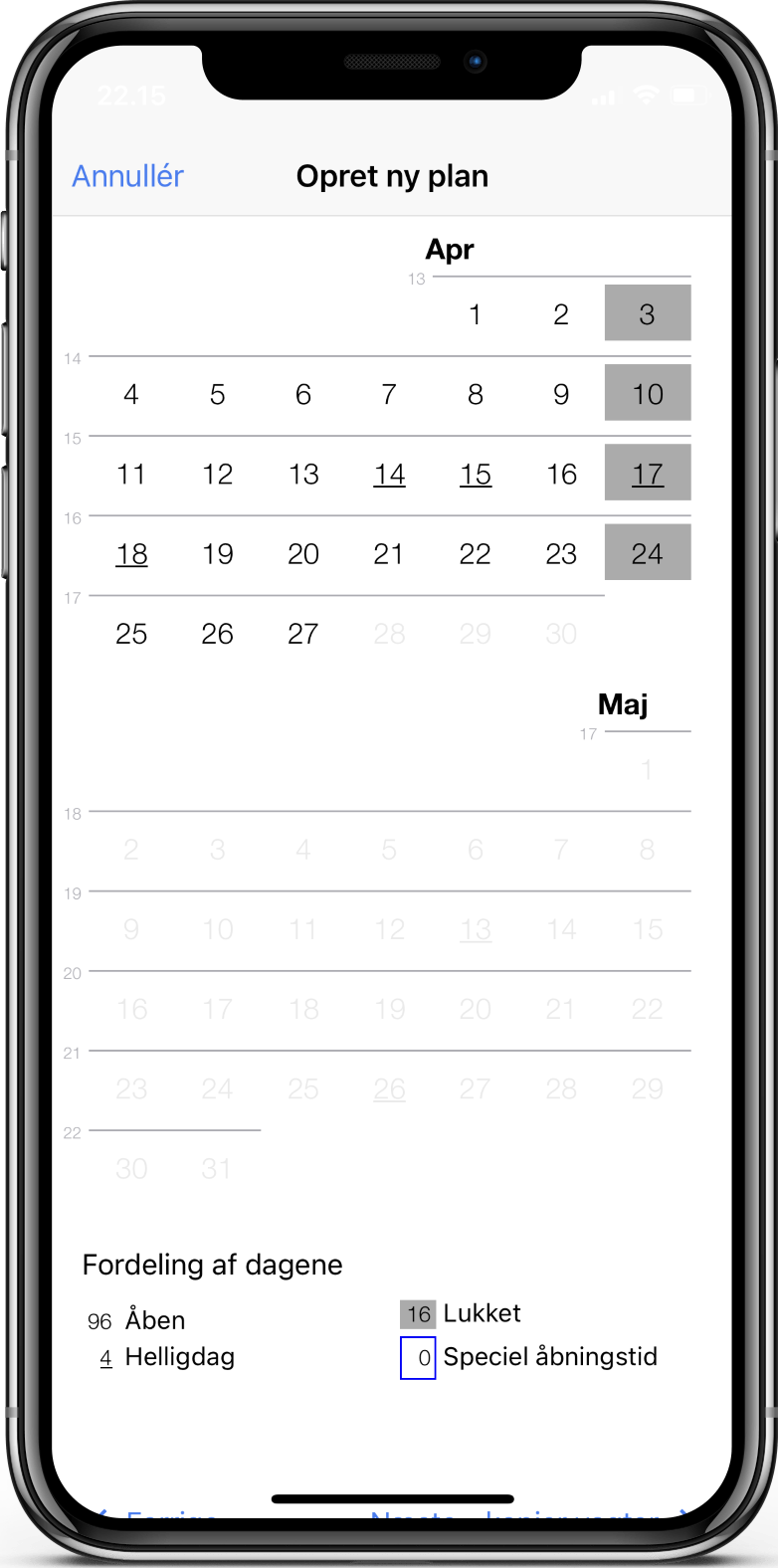 Efter tryk på OK ser du planen med angivelse af helligdage og lukkedage (som vises på baggrund af de generelle åbningstider, du tidligere har angivet).
